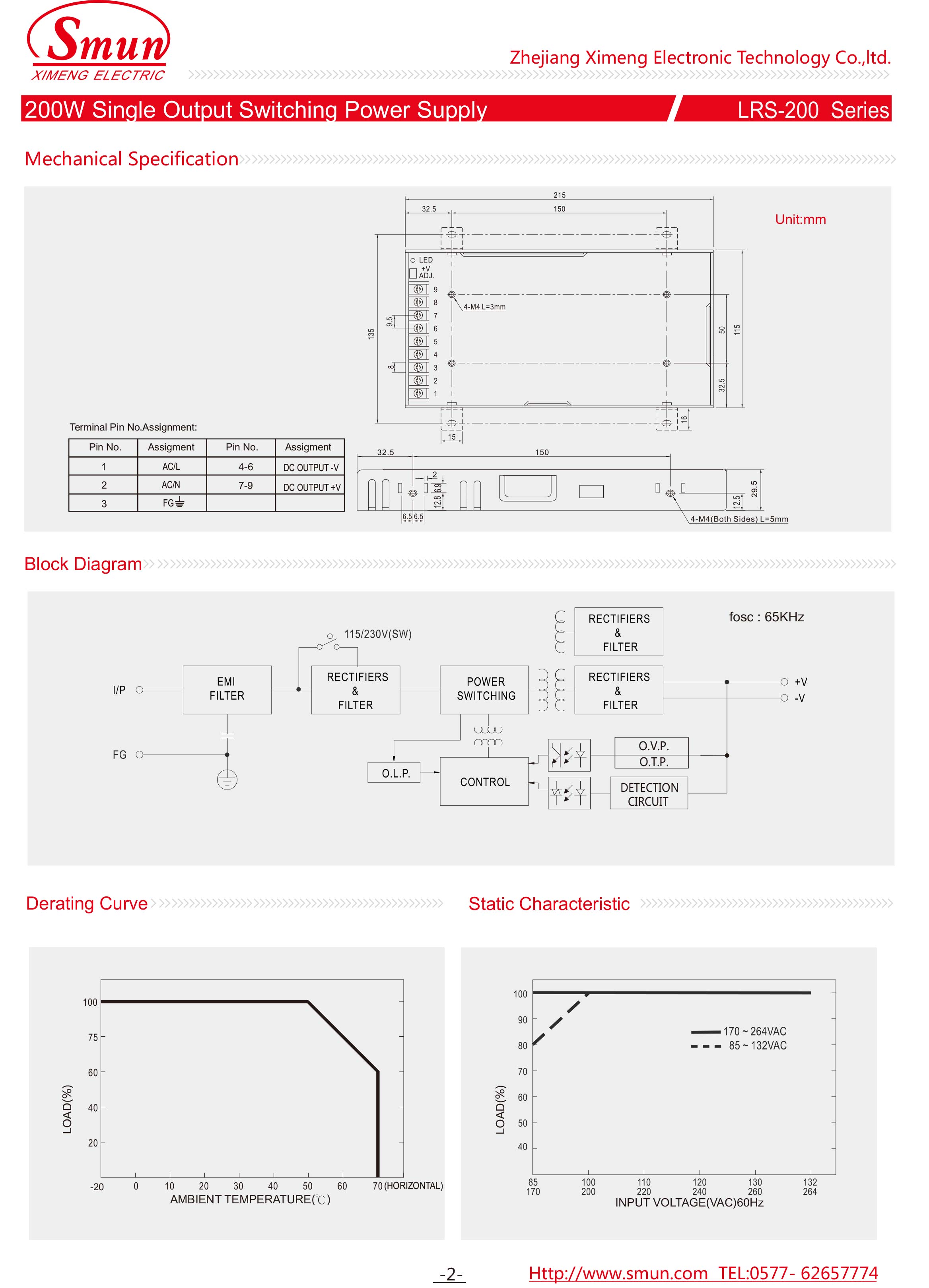 Серия LRS-200 представляет собой блок питания закрытого типа с одним выходом мощностью 200 Вт и низкопрофильной конструкцией 30 мм. Принимая входное напряжение 115 В переменного тока или 230 В переменного тока (выбирается переключателем), вся серия обеспечивает линию выходного напряжения 12 В, 15 В, 24 В, 36 В. и 48В.