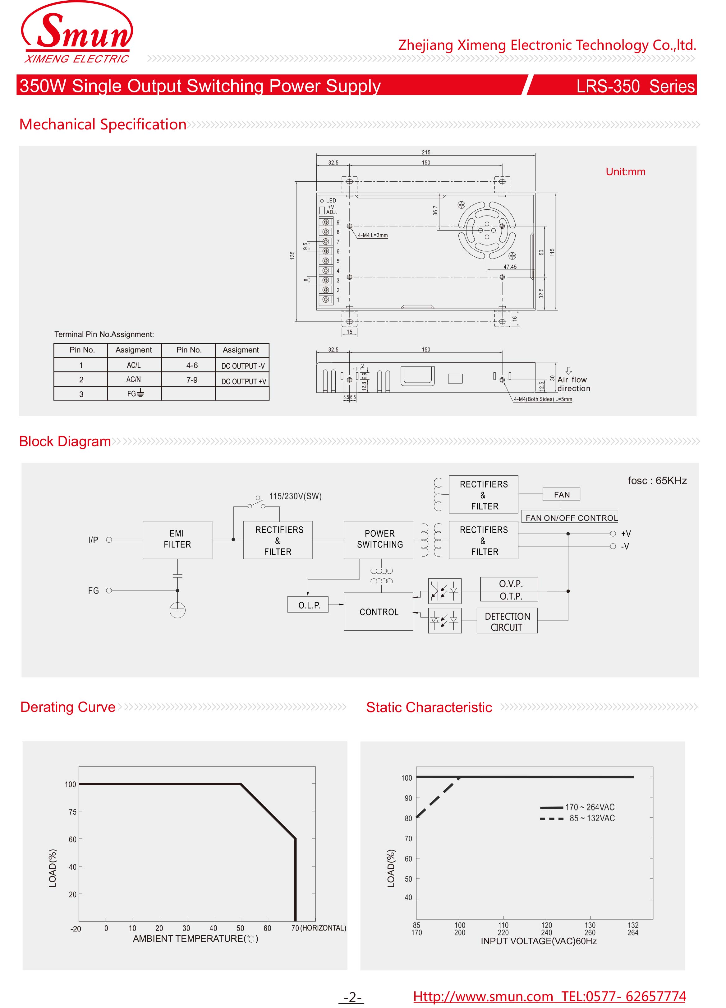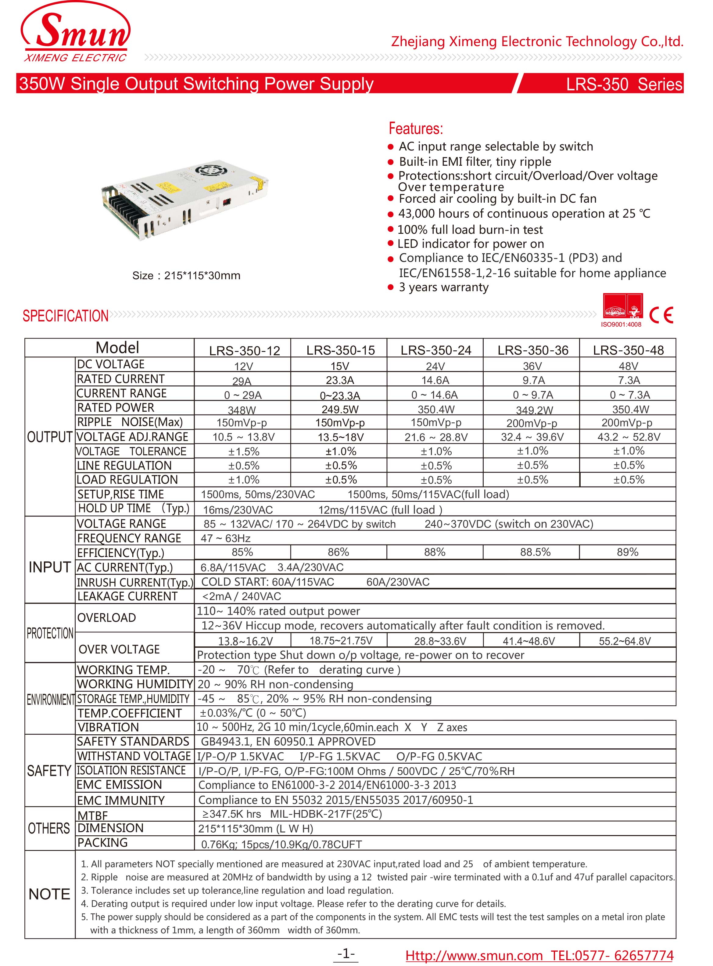 Серия LRS-350 представляет собой блок питания закрытого типа с одним выходом мощностью 350 Вт и низкопрофильной конструкцией 30 мм. Принимая входное напряжение 115 В переменного тока или 230 В переменного тока (выбирается переключателем), вся серия обеспечивает линию выходного напряжения 12 В, 15 В, 24 В, 36 В. и 48В.